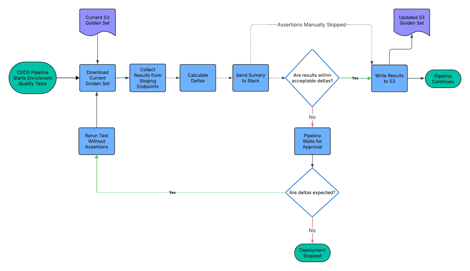 The Enrichment Quality Tests operate as a step in our CI/CD pipeline. Once new application code changes are live in our staging environment, we run a script which queries our enrichment API for each transaction. We also download a golden set of test results stored on S3. The results of the current deployment are then compared against the golden set to generate deltas. We set thresholds on certain key metrics. If the delta for a metric exceeds the threshold, then the test fails. Otherwise, if all the deltas are within acceptable thresholds the test passes and we write out the current results to S3 as our new golden copy. You can see a flowchart of this process below.